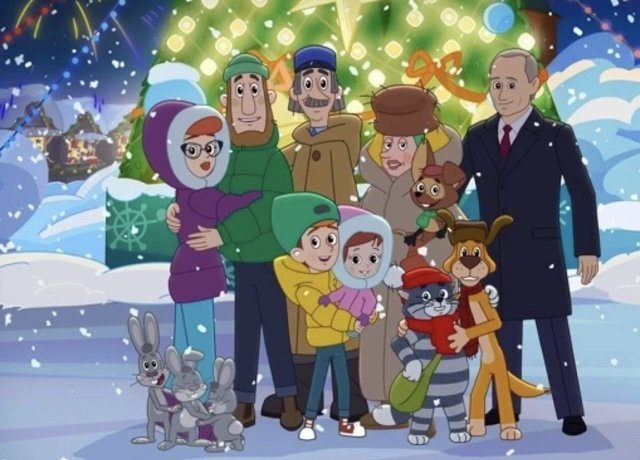 Kadrlarda Putin cizgi filminin qəhrəmanları - "Matroskin", "Şarik", "Poçtalyon Peçkin" və digər personajlarla birlikdə küknar ağacı fonunda görünür.