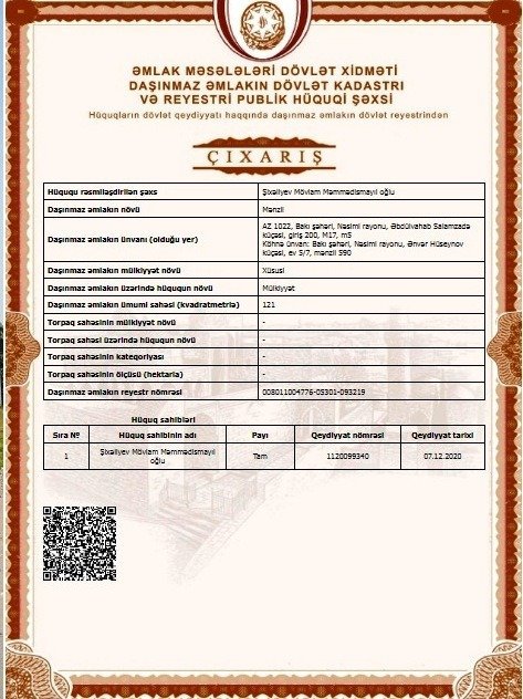 Mövlam Şixəliyevin mülkiyyətində olmaqla öz adına rəsmiləşdirilmiş: