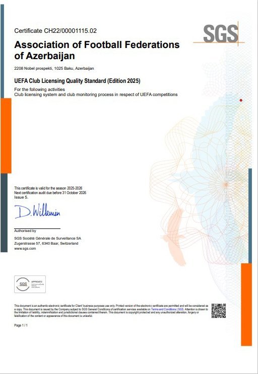 İsveçrənin SGS şirkəti AFFA-nın Klubların Lisenziyalaşdırılması Şöbəsinin 2025-ci ildəki fəaliyyəti ilə bağlı apardığı yoxlamanın nəticələrini açıqlayıb.