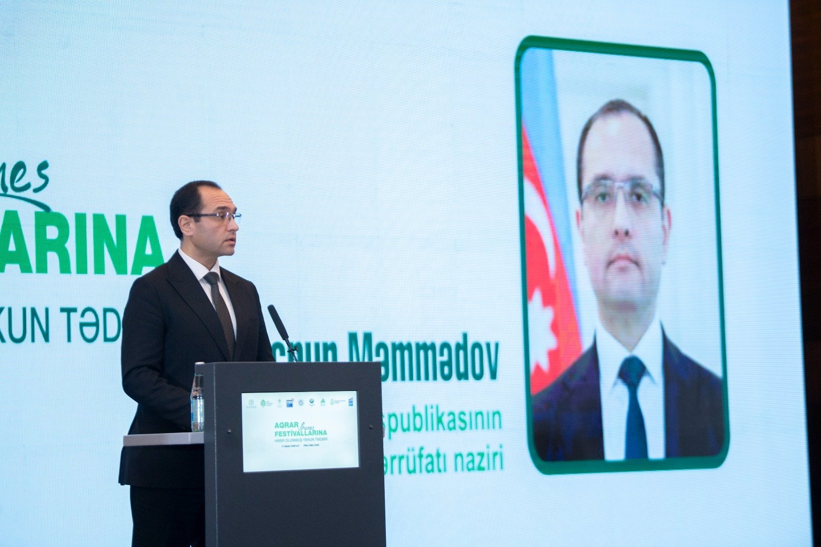 Tədbirdə açılış nitqi ilə çıxış edən kənd təsərrüfatı naziri Məcnun Məmmədov bildirib ki, Azərbaycan Respublikasının Prezidenti cənab İlham Əliyevin rəhbərliyi ilə həyata keçirilən sosial-iqtisadi inkişaf strategiyasında kənd təsərrüfatı prioritet və strateji sahələrdən biri kimi müəyyən edilib: “Son illərdə kənd təsərrüfatında istehsalın səmərəliliyinin artırılması, müasir texnologiyaların tətbiqi, fermerlərin maliyyə və texniki resurslara çıxışının asanlaşdırılması istiqamətində mühüm addımlar atılıb. Rəqəmsal həllərin tətbiqi, elektron kənd təsərrüfatı platformasının genişləndirilməsi, ekoloji cəhətdən dayanıqlı istehsal modellərinə keçid dövlət siyasətinin əsas istiqamətlərindəndir. İqlim dəyişikliklərinin təsirlərinin azaldılması, torpaq və su ehtiyatlarından səmərəli istifadə, eləcə də dəqiq kənd təsərrüfatının tətbiqi aqrar sektorun rəqabətqabiliyyətliliyini daha da artırır. Məhz bu strateji hədəflərin regionlarda təşviqi məqsədilə Aqrar Biznes Festivalları təşkil olunub. Cari ildə ölkənin 13 iqtisadi rayonunu əhatə edən 28 rayonda 32 festival keçirilib, 8 milyon manatdan artıq satış icra olunub. Festivallar çərçivəsində toxum sərgi-satış yarmarkaları, kredit yarmarkaları, panel müzakirələr və təlimlər təşkil edilib”.