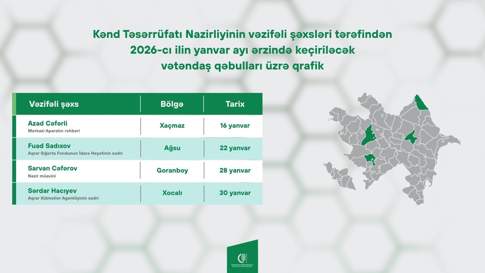 Kənd Təsərrüfatı Nazirliyinin vəzifəli şəxsləri tərəfindən 2026-cı ilin yanvar ayı ərzində keçiriləcək vətəndaş qəbulları üzrə qrafiki təqdim edirik:
