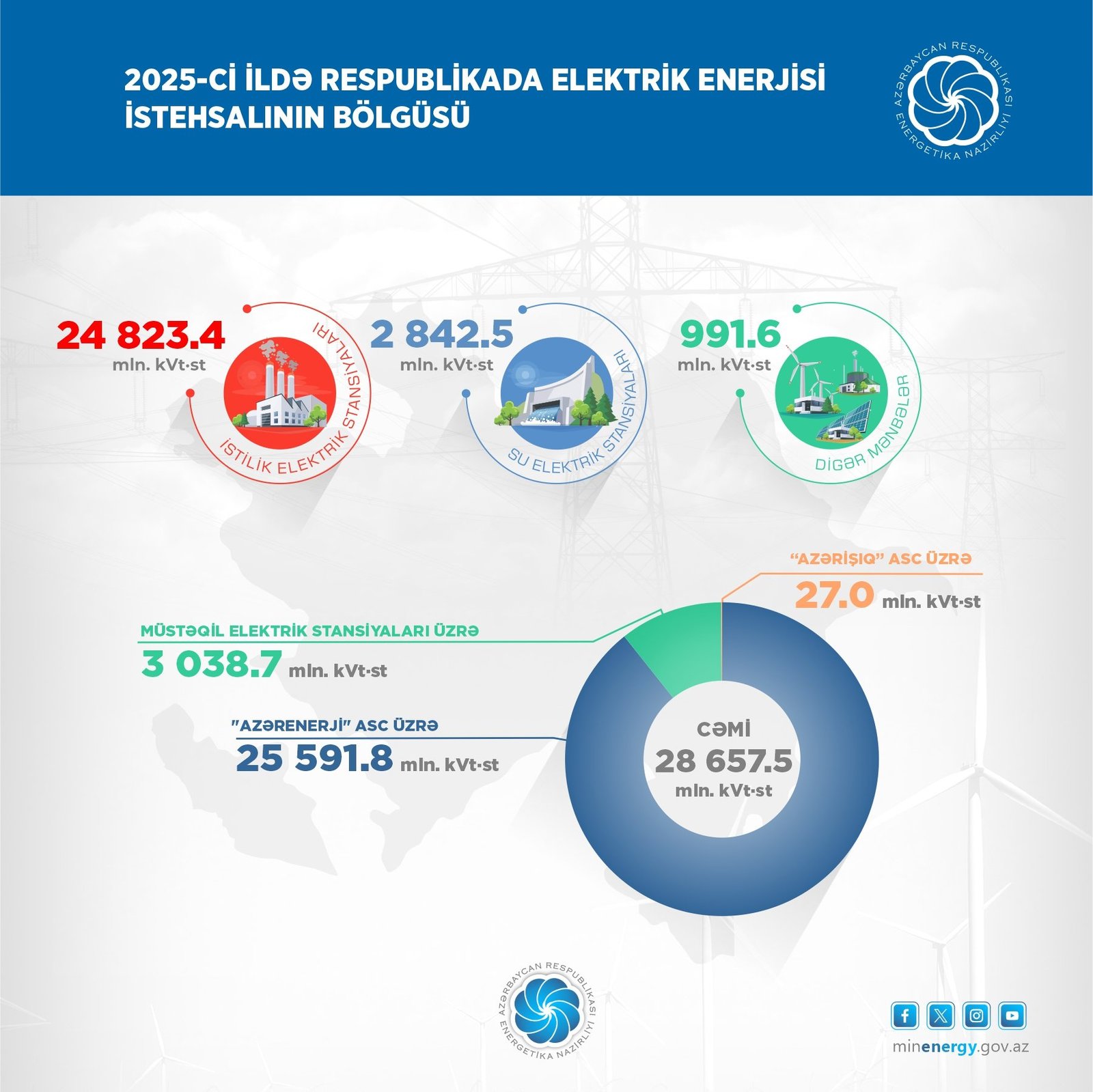 2025-ci ildə elektrik enerjisinin istehsalı “Azərenerji” ASC üzrə 25 591,8 mln. kVt•st (İES-lərdə 22 703,6 mln. kVt•st, SES-lərdə 2 827,1 mln. kVt•st, GES-lərdə 61,1 mln. kVt•st), “Azərişıq” ASC üzrə külək elektrik stansiyalarında 27,0 mln. kVt•st, müstəqil elektrik stansiyaları üzrə isə 3 038,7 mln. kVt•st təşkil edib.