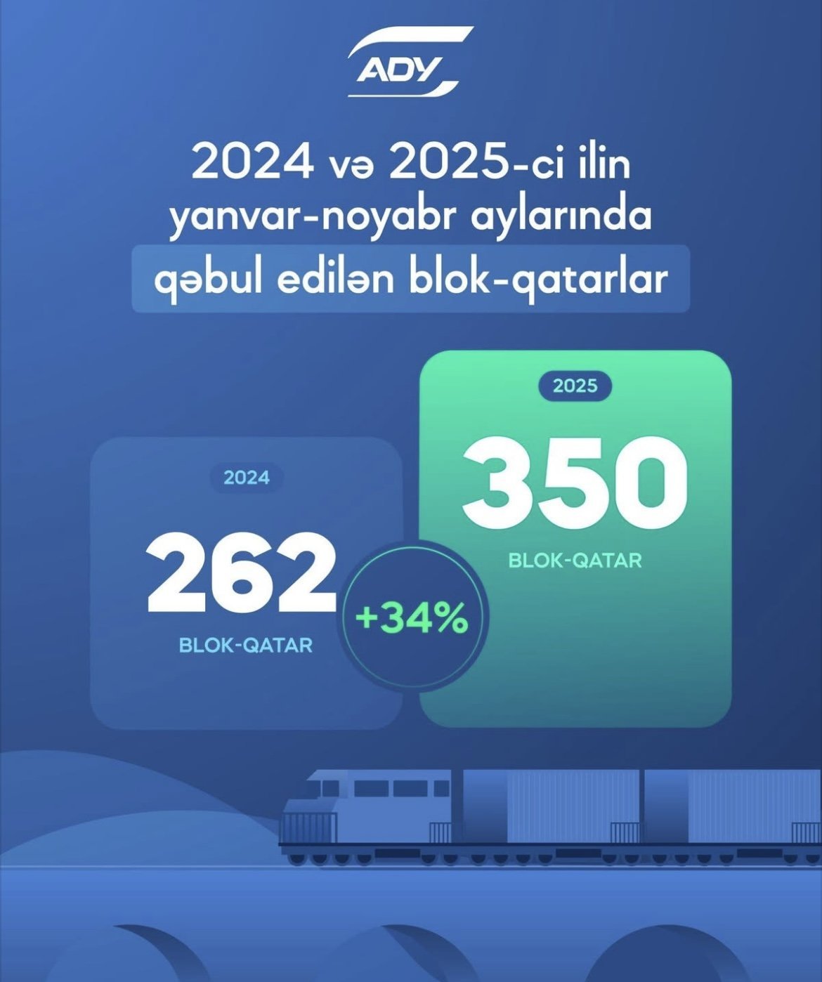 AZCON Holding şirkətlərindən olan Azərbaycan Dəmir Yolları (ADY) 2025-ci ildə 392 blok-qatar qəbul edib. Bu, 2024-cü ilin göstəricisi (287 blok-qatar) ilə müqayisədə 37% artım deməkdir.