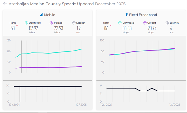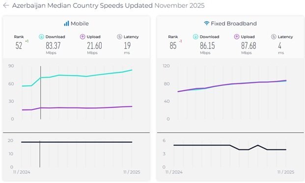 Yeni hesabata görə, Azərbaycanda sabit genişzolaqlı internetin median sürəti 88,83 Mb/s, mobil internetin median sürəti isə 87,92 Mb/s olub.