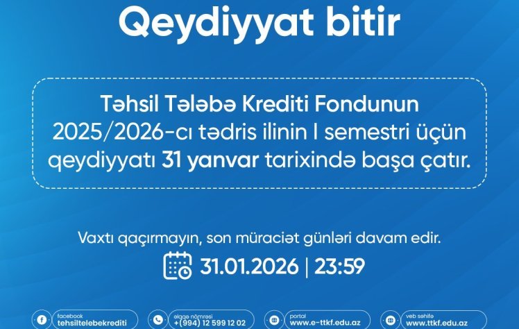 Təhsil Tələbə Krediti Fondunun məlumatına əsasən, 2025-2026-cı tədris ilinin payız semestri üzrə təhsil tələbə kreditlərinə (TTK) müraciətlərin qəbulu 31 yanvar 2026-cı il tarixində saat 23:59-da başa çatacaq. Müraciət etmək istəyən şəxslərə prosesi qeyd olunan tarix və vaxta qədər tamamlaması tövsiyə olunur.