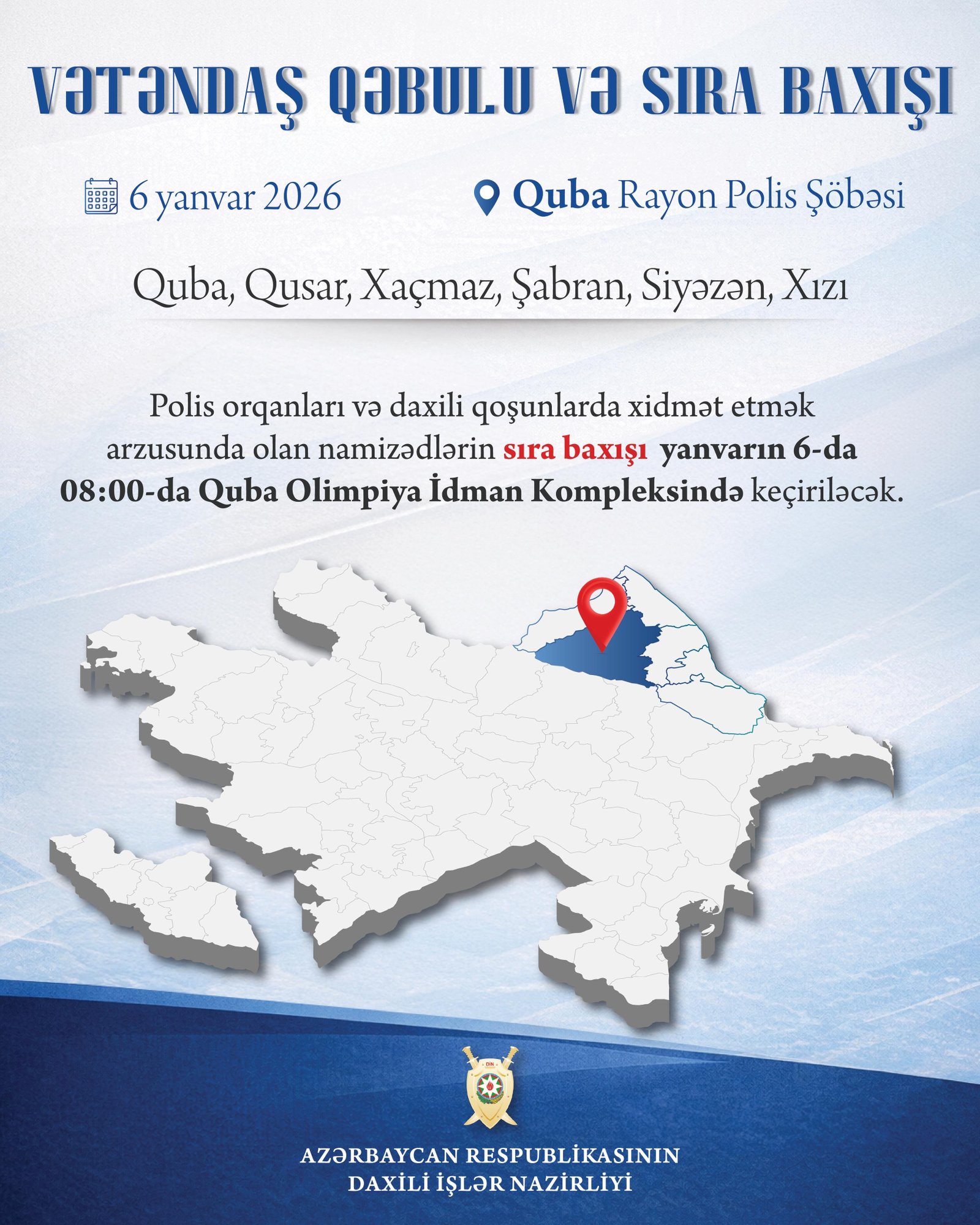 Qəbul saat 11:00-dan başlayaraq Quba rayon Heydər Əliyev Mərkəzində (ünvan: AZ4000, Quba şəhəri, Heydər Əliyev adına mədəniyyət və istirahət parkı) keçiriləcək.