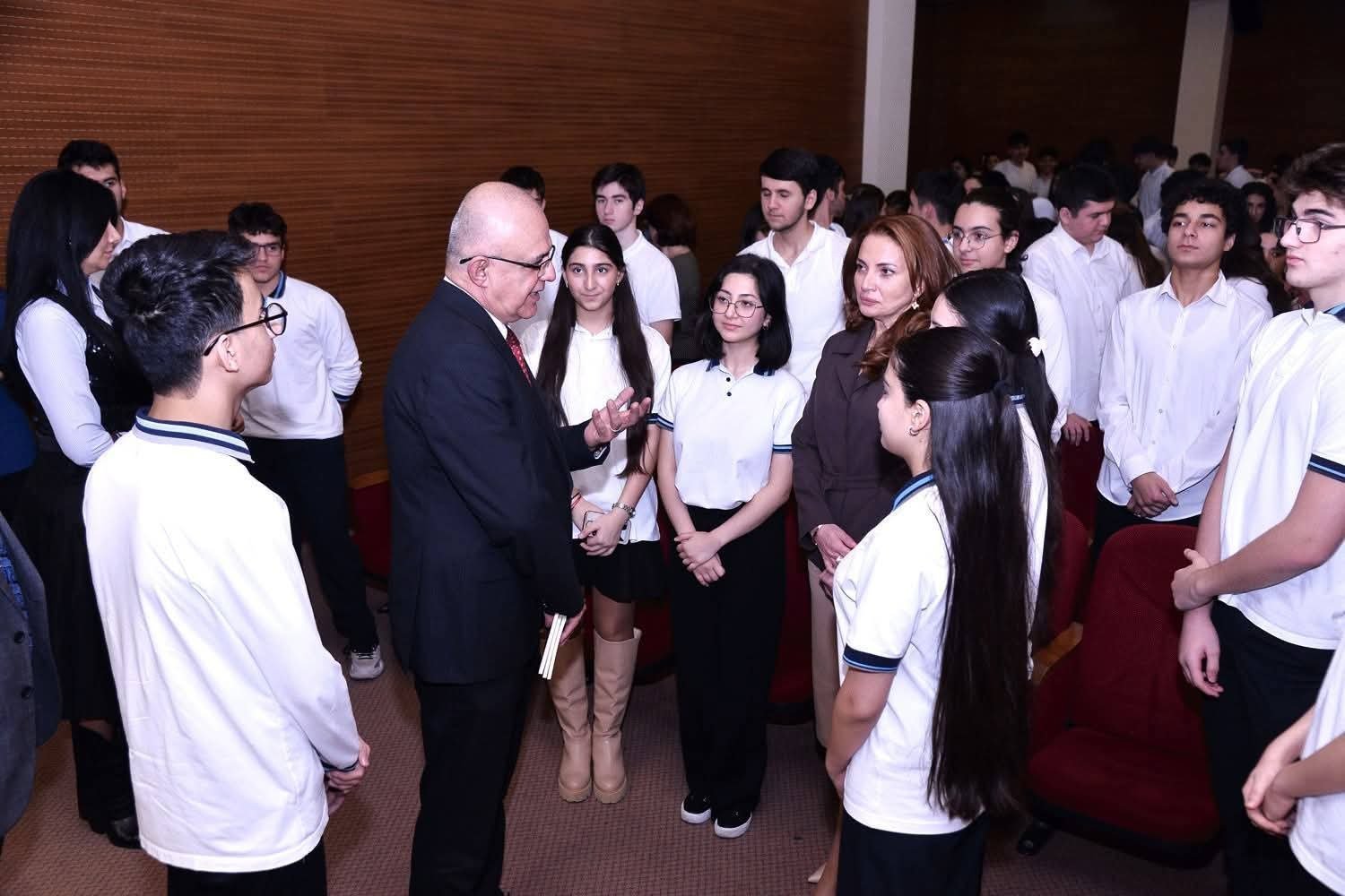 Qonaq məktəblilərlə söhbətə özünün məktəb illəri, müəllimləri ilə bağlı xatirələrindən, ölkəmizin müstəqillik uğrunda mübarizəsinin başlandığı dövrlərə təsadüf edən gənclik, tələbəlik illərindən başladı.